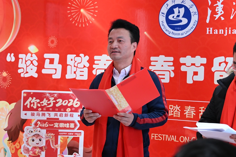 “汉师就是你们的第二个家!”吴红斌在致辞中亲切地说道。他回顾了过去一年全校师生共同奋斗的足迹,展望如骏马奔腾的新年愿景。话语间充满对同学们日常生活的细细关心、对安全健康的再三叮嘱、对未来发展的殷切祝福。